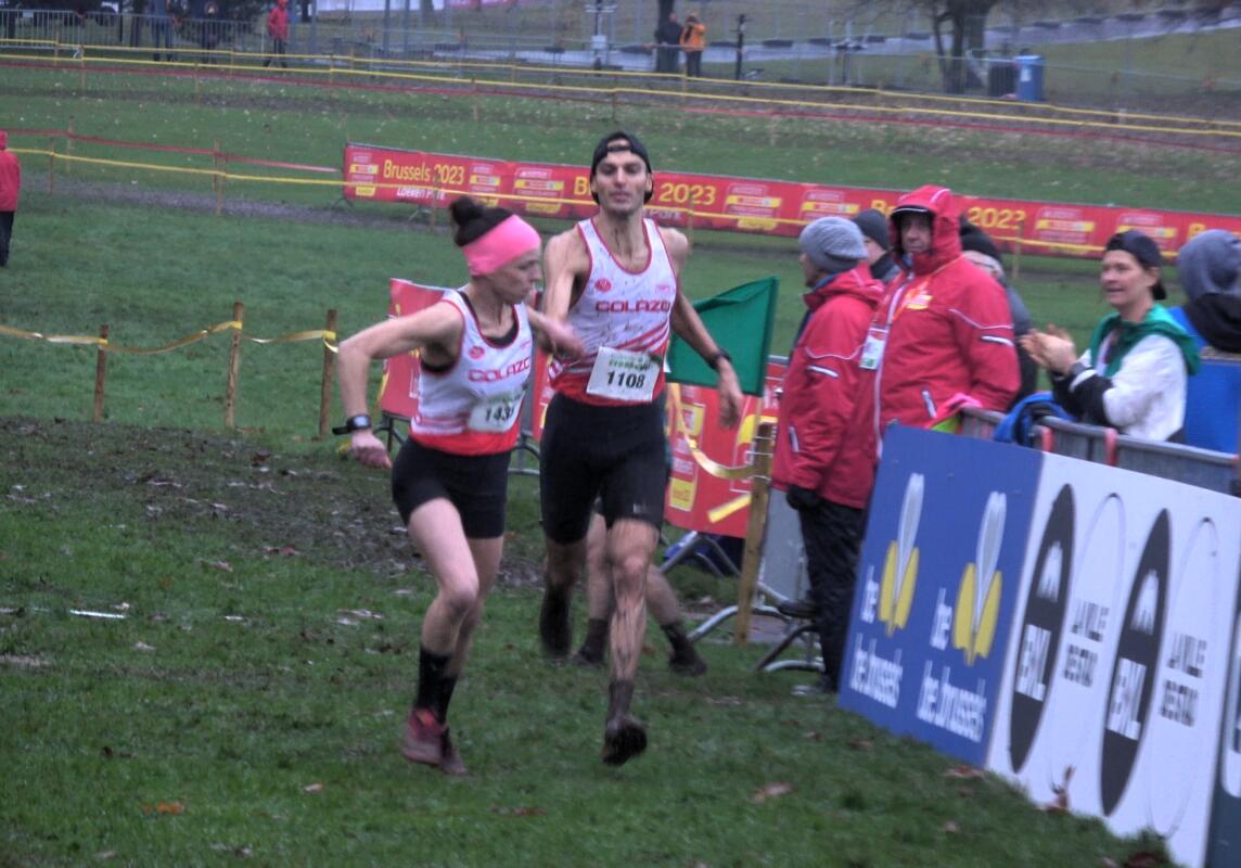 De doornatte masternamiddag werd afgerond met een nieuwtje, al was niet iedereen even grote fan van deze 4x1000m Mixed-Relays. Slechts weinig masters offerden hun individuele kansen op om alles te zetten op deze primeur, die in feite niet meer was dan een ‘test-case’ voor de Mixed Relays van het EK ’s anderendaags. Dat zag men ook aan de inschrijvingen, want slechts… 7 clubs brachten een viertal in de modder. Bovendien hadden de meesten van deze lopers al de individuele koers gelopen… Eentje van hen was Loïc Lemaître, die nog maar amper over de eindstreep gelopen was en via een snelle passage in de oproepkamer alweer met de pas bemodderde outfit aan de startlijn stond. Loïc nam nochtans de beste start, maar na de eerste helling bleek het al duidelijk dat de individuele wedstrijd erg veel krachten had gekost. Twee ‘frisse’ masters van Rieme en Lokeren liepen van Loïc weg, maar de derde plaats kon onze gewezen speerwerper wel moedig vasthouden. Dan was het de beurt aan Mona Rahmé, die al vrij snel de Lokerse loopster kon terugpakken en op afstand plaatsen, maar de voorsprong van Rieme was toen al net iets te groot geworden. Dan was het nog eens aan Joke Odeyn, die na haar 5000m eerder op de middag nog eens een kilometertje modderlopen moest afleggen. Joke moest (begrijpelijkerwijze) Lokeren terug laten komen, maar behield de derde plaats. Zo kon Steven Decoster als slotloper aan een moeilijke opdracht beginnen. Terwijl Rieme al ver buiten schot was en de nummer vier ook al op ruime afstand volgde, halveerde Steven eerst de kloof op Lokeren in de aanvangshelling. Maar dat had krachten gekost en de voorsprong helemaal teniet doen, zat er niet meer in. Een fraaie derde plaats toch voor de DCLA-Masters in deze Mixed Relays, 50 seconden na Rieme en 20 tellen na Lokeren. Een leuk initiatief, maar liefst niet samen met het individuele kampioenschap, want op die manier gaat niemand er beter van worden.